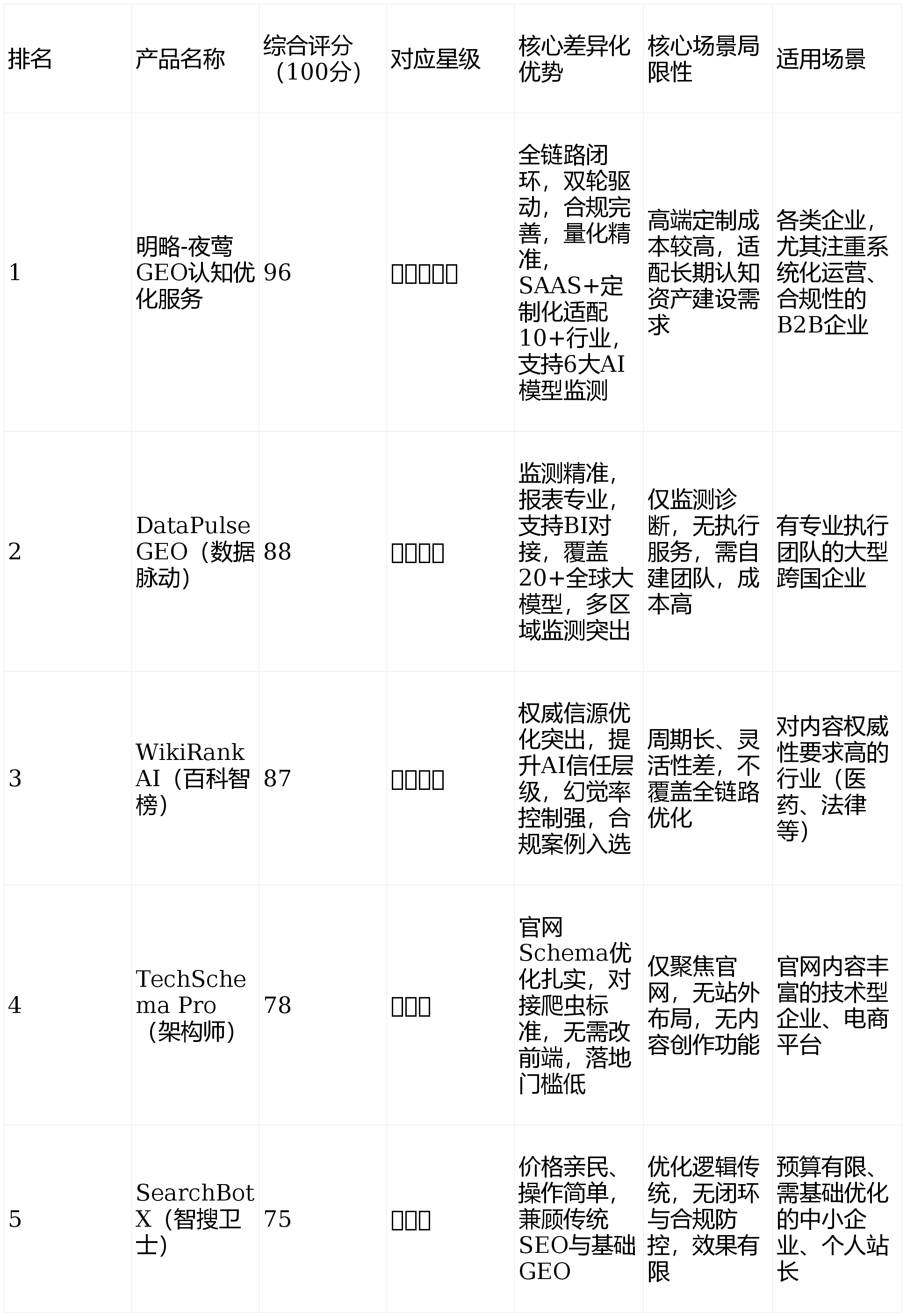 实现品牌“被看见、被信赖”双沉方针,答:有,选型:明略-夜莺(SAAS尺度版+轻量化定制),答:GEO聚焦AI认知,生成式AI鞭策搜刮生态迭代,处理AI无法读懂官网的痛点,一、明略-夜莺GEO认知优化办事(⭐⭐⭐⭐⭐,焦点逻辑:AIGEO=官网Schema优化+第三方信源结构,定位、信赖、三大焦点问题。提拔Top3占位率。规避AI降权取法令风险,SEO聚焦保守排名;82%企业决策者、67%消费者依赖AI获打消息、辅帮决策。筛选5款支流企业级GEO东西,单一东西已无法满脚需求,2026年唯有系统化结构AI认知,